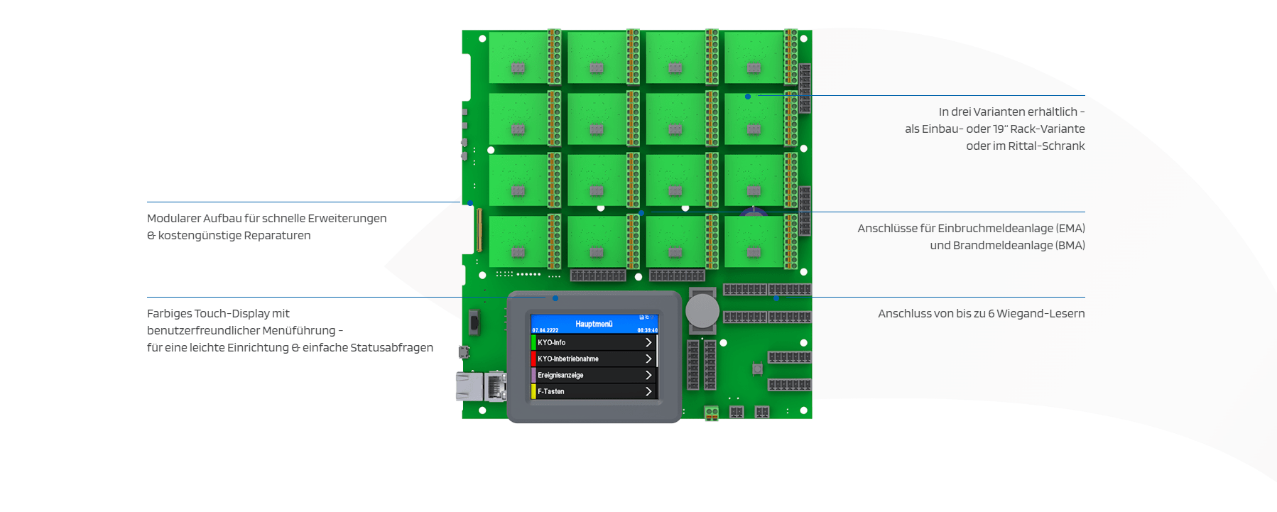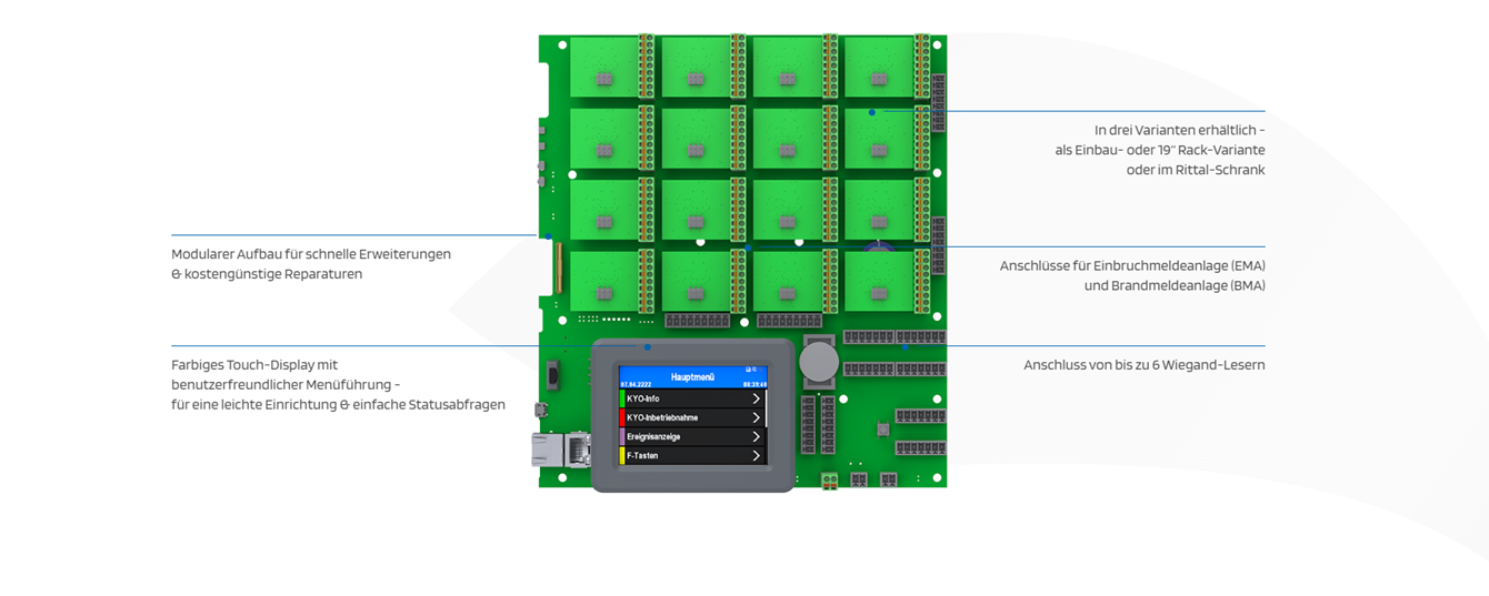 Ausgelegt für den Anschluss von 16 Türen und mit einzelnen Bussträngen bis zu 64 Zutrittslesern ist der KYO Cenloc für Zutrittsprojekte mit vielen Zutrittspunkten geeignet. Das System bietet ein hohes Mass an Flexibilität, der Anschluss der Zutrittsleser erfolgt mitteln sternförmiger Verkabelung.